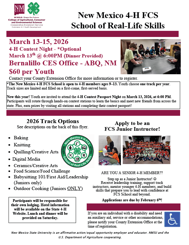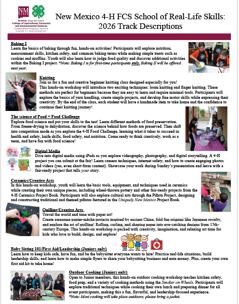 The New Mexico 4‑H FCS School is open to currently enrolled 4‑H members ages 9–13. Each participant may choose one track per year.